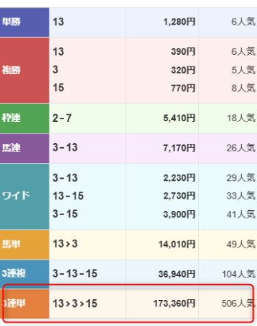 1着⑬ビルバンテ(6番人気)—2着③メビウスロマンス(5番人気)—3着⑮ヘイスティハート(8番人気)と、