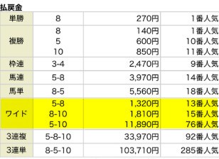 大穴の馬⑤⑩の2頭どちらかが、3着以内に入着した場合は配当に期待できます。
