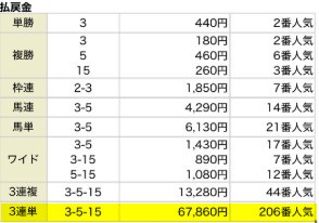 ※3連単③-⑤-⑮(1点500円購入):339,300円