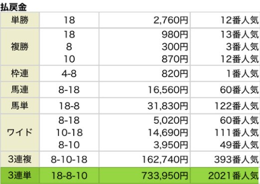 ※3連単⑱-⑧-⑩(1点800円購入):733,950円