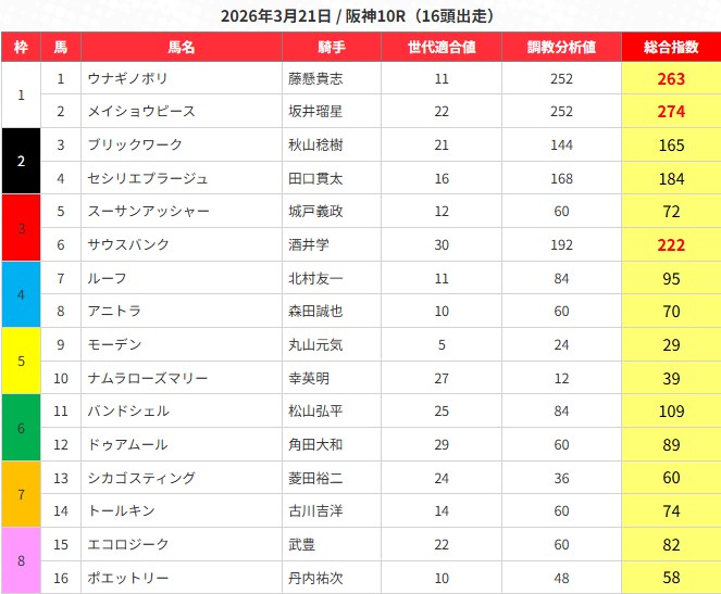 特に①④③の指数上位馬が1頭でも入着すれば、